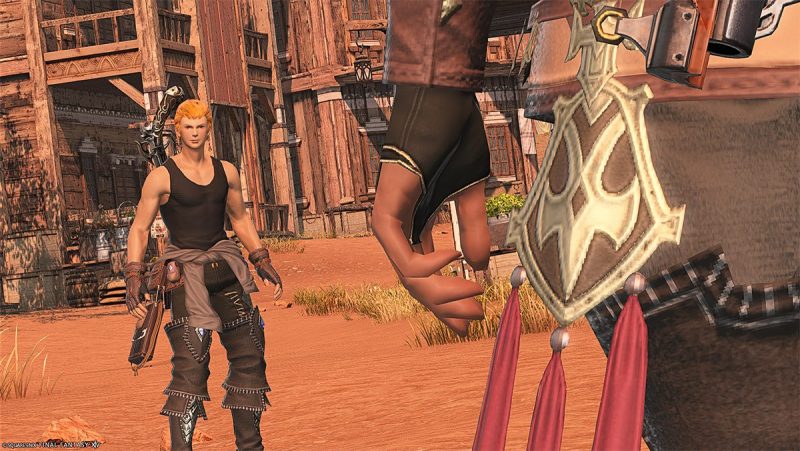 いかにも西部劇!って感じのシャーローニ荒野のフーサタイ宿場町に到着。何やらもめているようで、いかにもやんちゃなリーゼントのデコワと自警団副長のウィフーテがやりあっていた。そこに仲裁に入る…エスティニアン。おったんかワレェ!( ゚д゚ )